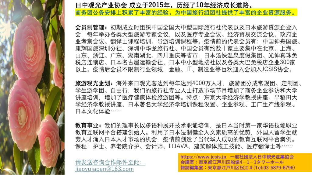 日中观光产业协会(以下简称JCSIS),成立于2015年,举办各种教育培训课程、展会、研讨会、企业参观活动等。疫情前由中国各大旅行社和日本酒店集团运输企业免税店百货店连锁企业以及数百家旅行社等构成我们JCSIS的会员单位,每年会员企业综合营业额1600亿日元以上的成绩取得。2023年开始,侧重以调查研究中日经济经验学术目的为主,JCSIS会员采取由中国和日本2国的金融机构金融企业、建筑建设房地产企业、制药企业、制造业、物流设备制造物流系统开发类企业、观光旅游产业类企业、教育机构、信息技术企业,高尔夫俱乐部等各种体育类产业机构等组成。分赞助类企业会员、企业会员、个人会员、专家组会员等、JCSIS的工作目的是促进中日友好,为中日企业合作顺利以及经济发展取得优异成绩而贡献一份力量。