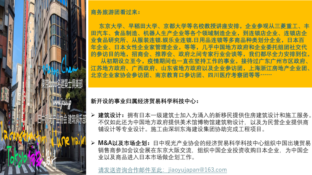 当然不仅是教育、经济上中日来往频繁,就旅游和居家生活也一样受到中国企业家挺的青睐,日本的东京・京都・福冈・名古屋・大阪等也成为中国知识分子富有层的首选的定居城市。